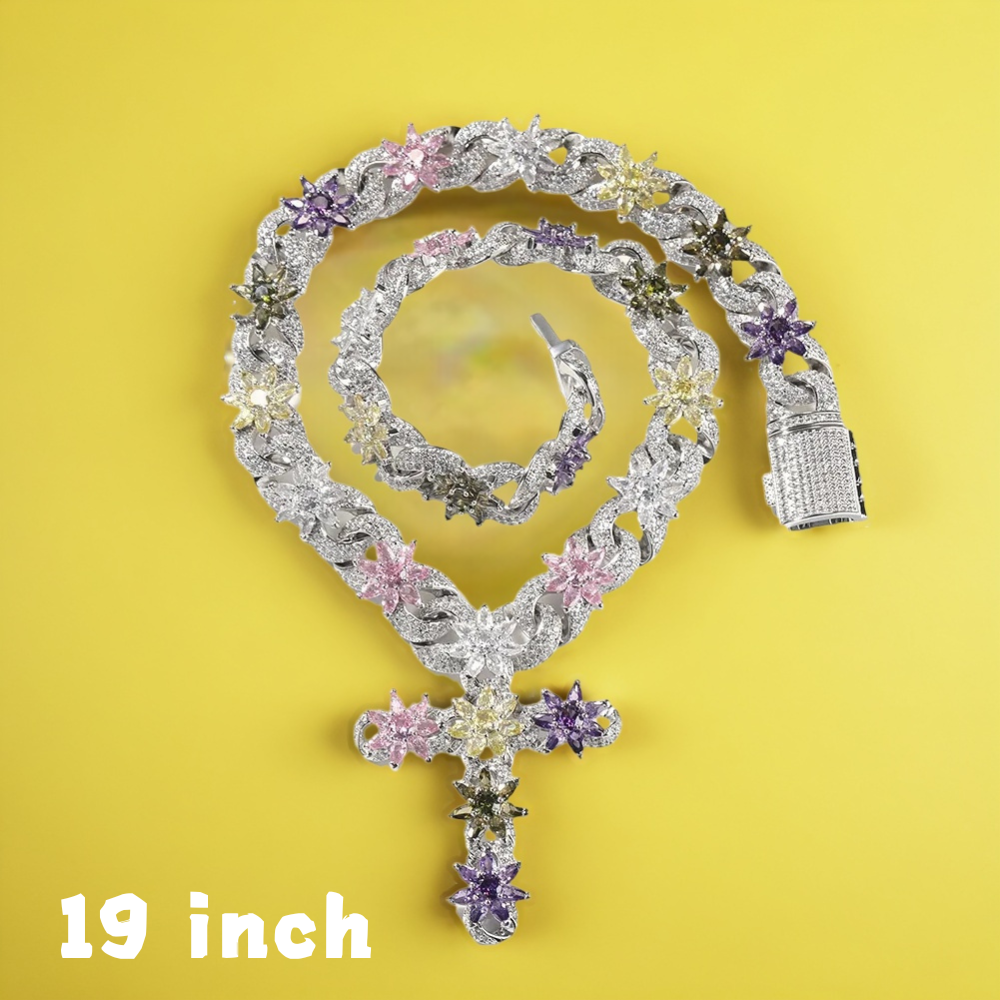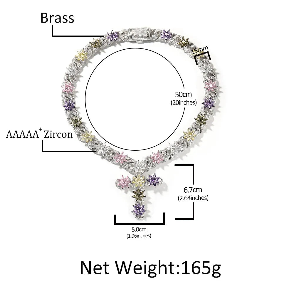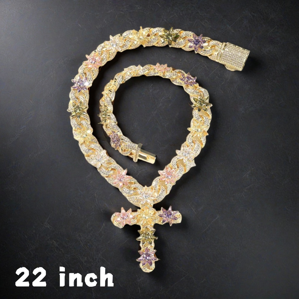 Cuban link chain with cross is a bold statement piece, adding eye-catching flair to any outfit with its vibrant multi-colored zircon flower pendant design and substantial feel.